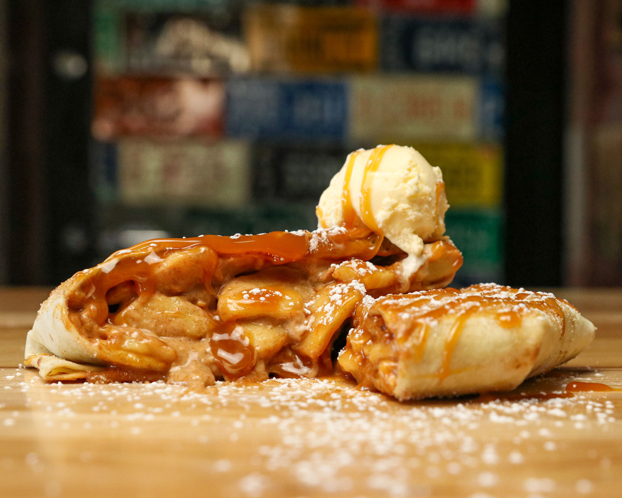 Apple pie filling, cream cheese and a fried cinnamon sugar naan, wrapped in a warm tortilla and seared. Topped with a scoop of ice cream, caramel drizzle and cinnamon sugar. No side included.