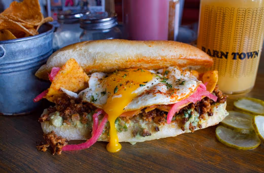 Diced Chorizo topped with chilaquiles tortilla chips, lime crema, pickled red onions, a sunny egg & guacamole. Served on a telera hoagie.